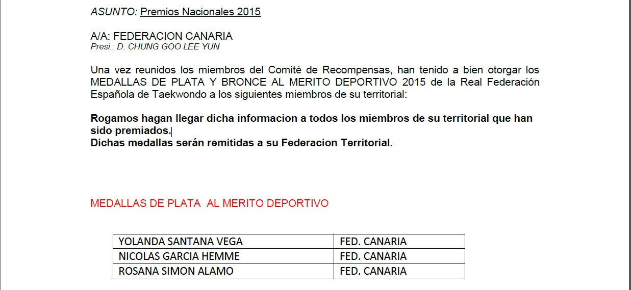 Una vez acordado y tramitado desde esta Federación Canaria de Taekwondo y D.A. las propuestas a los Premios Nacionales 2015, el Comité de Recompensas de la Real Federación Española de Taekwondo ha decidido otorgar las siguientes Medallas de Plata al mérito deportivo a los canarios: