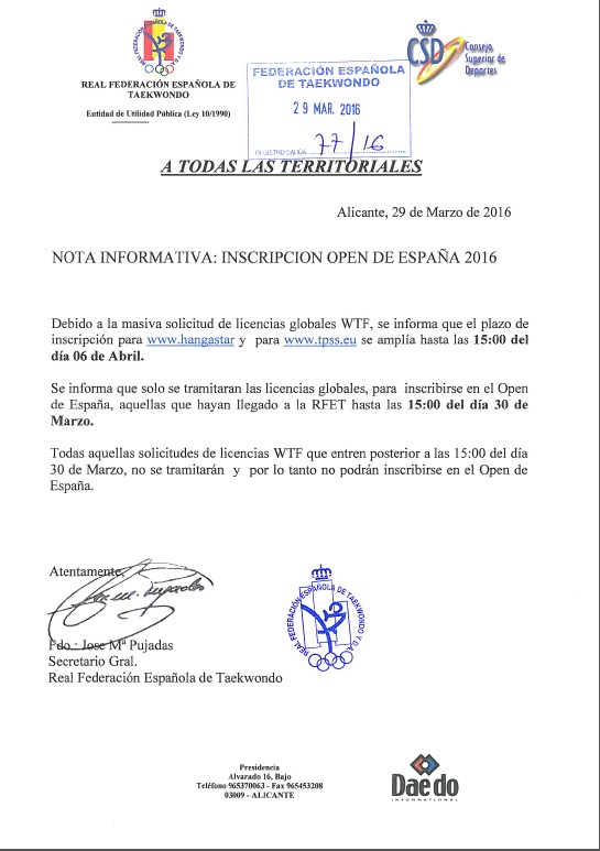 Hemos recibido de la Real Federación Española de Taekwondo la siguiente circular sobre el Open de España 2016: