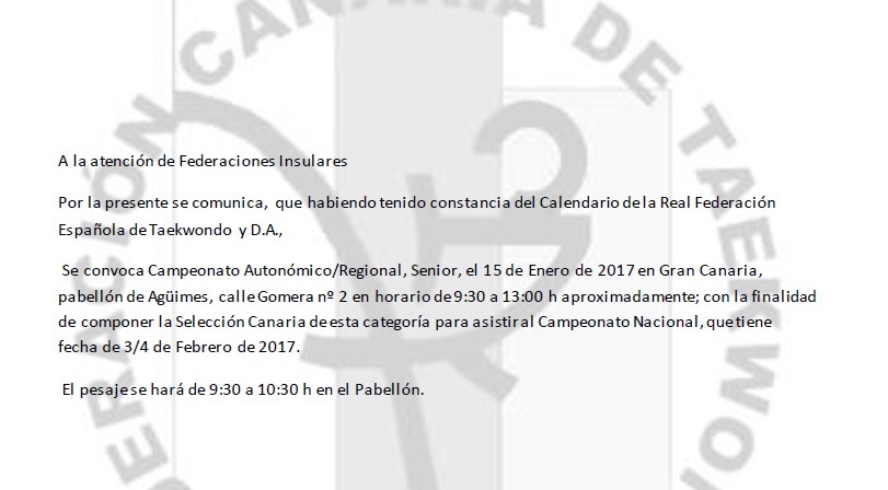 Por la presente se comunica, que habiendo tenido constancia del Calendario de la Real Federación Española de Taekwondo y D.A., se convoca el Campeonato Autonómico/Regional Senior, para el día 15 de Enero de 2017, en la isla deGran Canaria, pabellón de Agüimes, calle Gomera nº 2; en horario de 9:30 a 13:00 h, aproximadamente. Con la finalidad de componer la Selección Canaria de esta categoría para asistir al Campeonato Nacional, que tendrá lugar los dias 3 y 4 de Febrero de 2017.