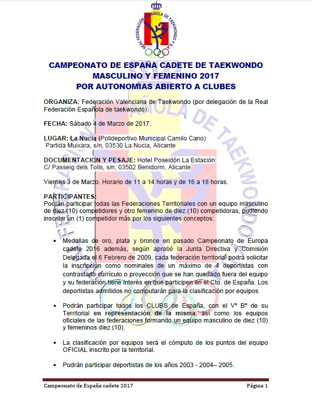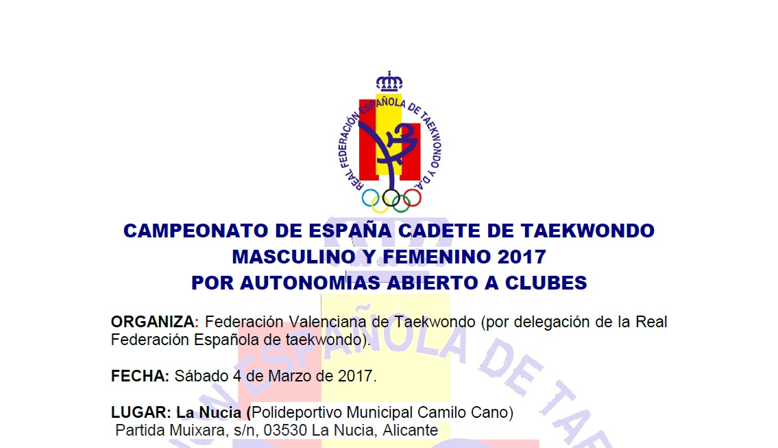 CIRCULARES Y COMUNICADOS FEDERACIÓN CAMPEONATO DE ESPAÑA CADETE 2017: CIRCULAR RFET 07/02/2017 admin Información sobre el Campeonato de España Cadete 2017, a celebrar en la provincia de Alicante.